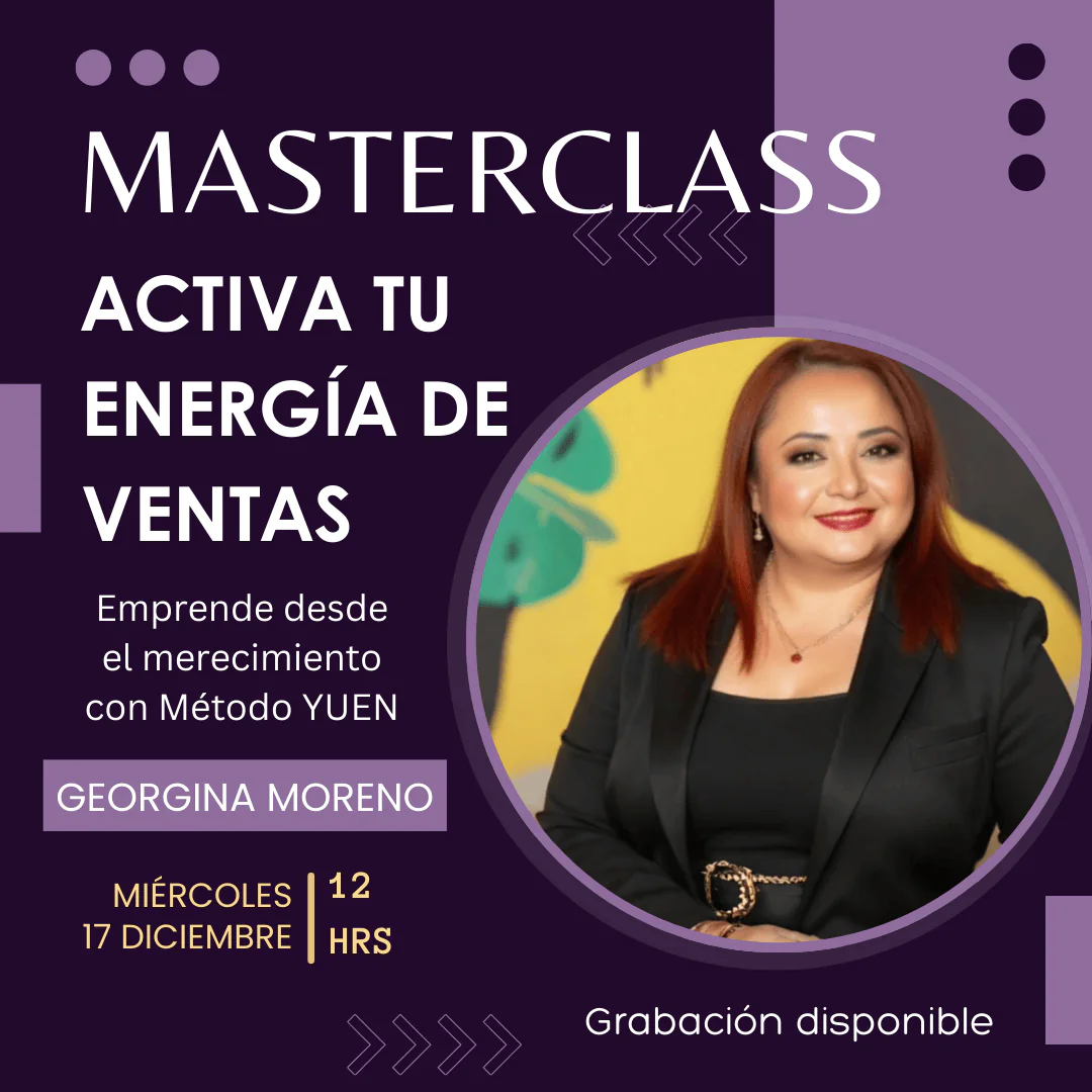 De la mano de Georgina Moreno, trabajaremos los factores energéticos que bloquean tus ventas, tu seguridad personal y el crecimiento de tu negocio. A través del Método Yuen, identificaremos y borraremos debilidades como miedo a vender, rechazo, autoexigencia o dudas que frenan tu avance.